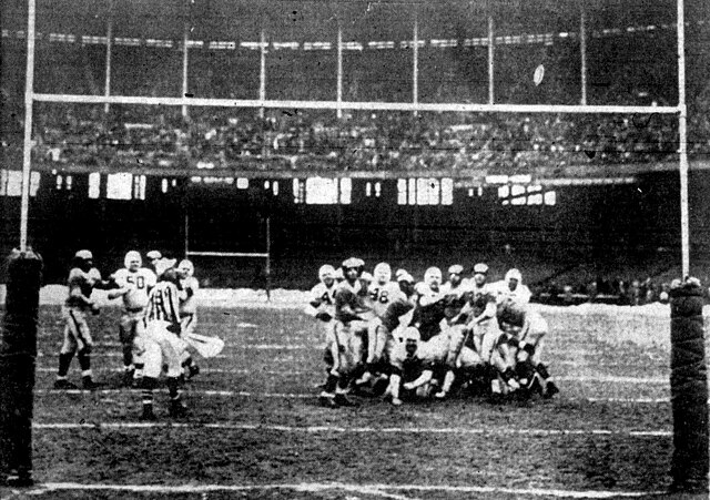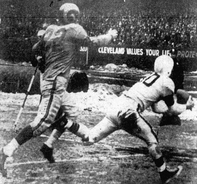 Cleveland Browns kicker Lou Groza seals the 1950 NFL Championship for his team with a successful 14-yard field goal with 28 seconds remaining. The Browns defeated the visiting Los Angeles Rams, 30–28, at Cleveland Stadium on December 24, 1950.