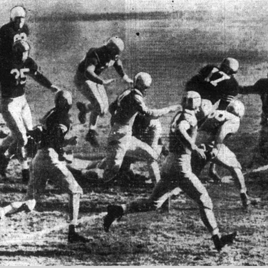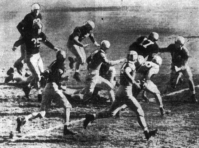 The opening kickoff of the 1946 “Game of the Century” between the Army Black Knights and Notre Dame Fighting Irish on 9 November 1946 at Yankee Stadium in the Bronx, New York. Army quarterback Arnold Tucker (number 17) completed a 23-yard return. Notre Dame halfback Emil Sitko (number 14) made the tackle.