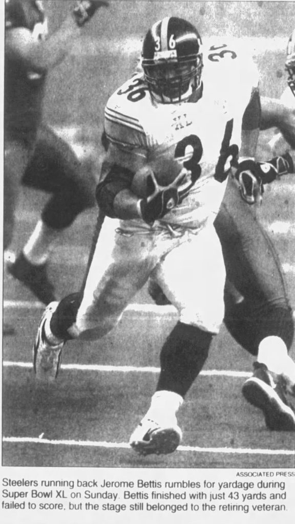 ” I think the Bus’ last stop is here in Detroit.” ~ Steelers’ Running back Jerome Bettis just after Pittsburgh won its sixth Lombardi Trophy in Super Bowl XL by defeating Seattle 21-10 at Ford Field in Detroit.