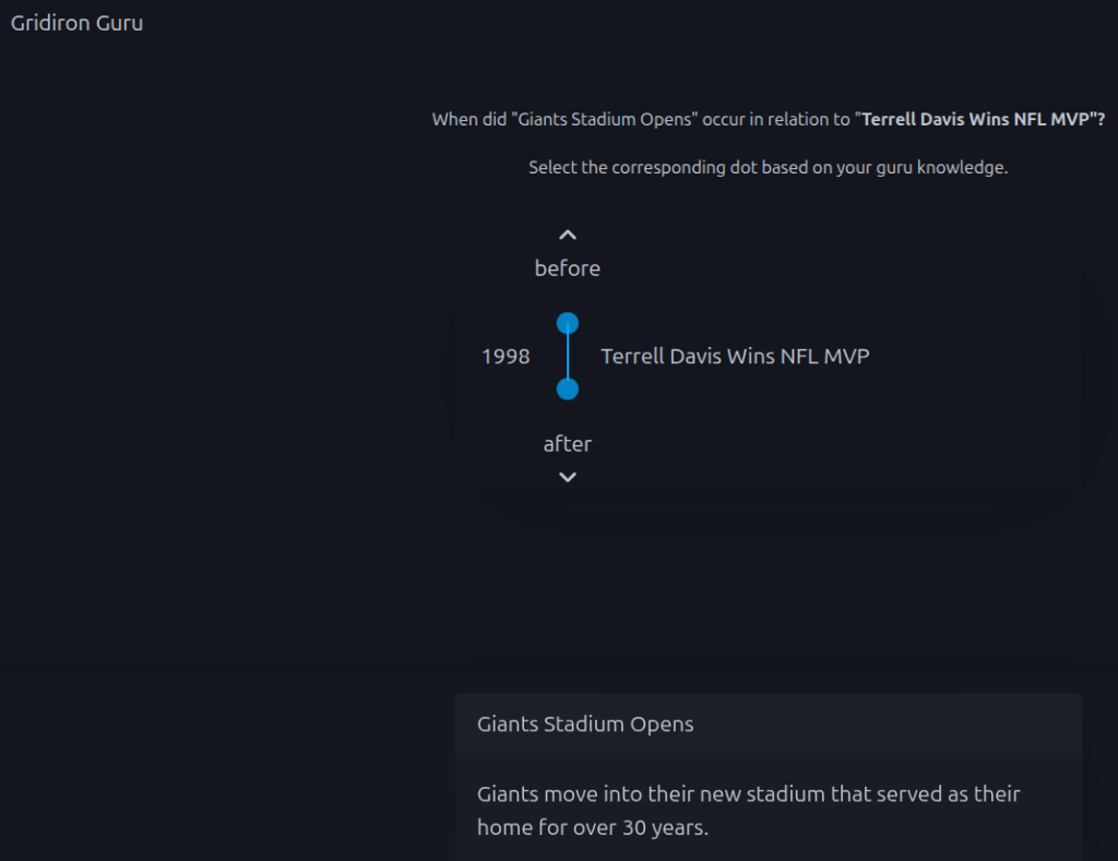 Here’s how it works: Every day, you get a fresh round of eight facts—everything from major Super Bowl milestones to obscure franchise moves (did you know the Redskins started in Boston?). You get one event at a time and have to decide where it fits on a chronological timeline.