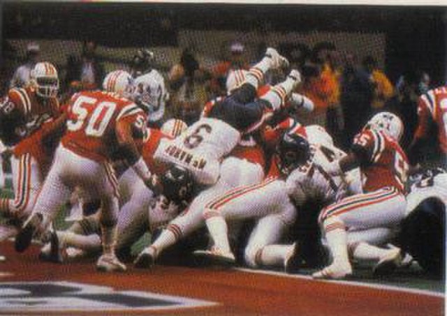 Chicago quarterback Jim McMahon dives into the end zone for a touchdown, as the Bears demolish the New England Patriots 46-10 in Super Bowl XX. The free-spirited McMahon also ran for another touchdown and passed for 256 yards. In winning by the largest margin in Super Bowl history, the Bears outgained the Patriots 408-123 and finished with an 18-1 record. Jeno’s Pizza promotional 1986