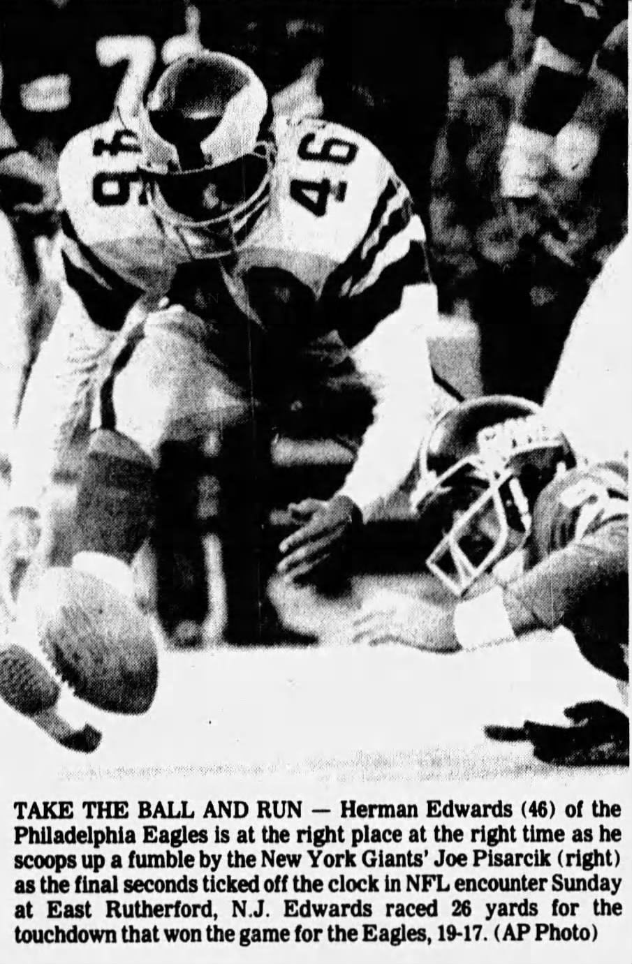 Instead of ending the game, the Giants coaching staff inexplicably called for a running play. Pisarcik took the snap and attempted to hand the ball off to running back Larry Csonka. The execution was a catastrophic failure: the handoff was fumbled, the ball bounced free, and Eagles cornerback Herman Edwards swooped in to scoop it up.