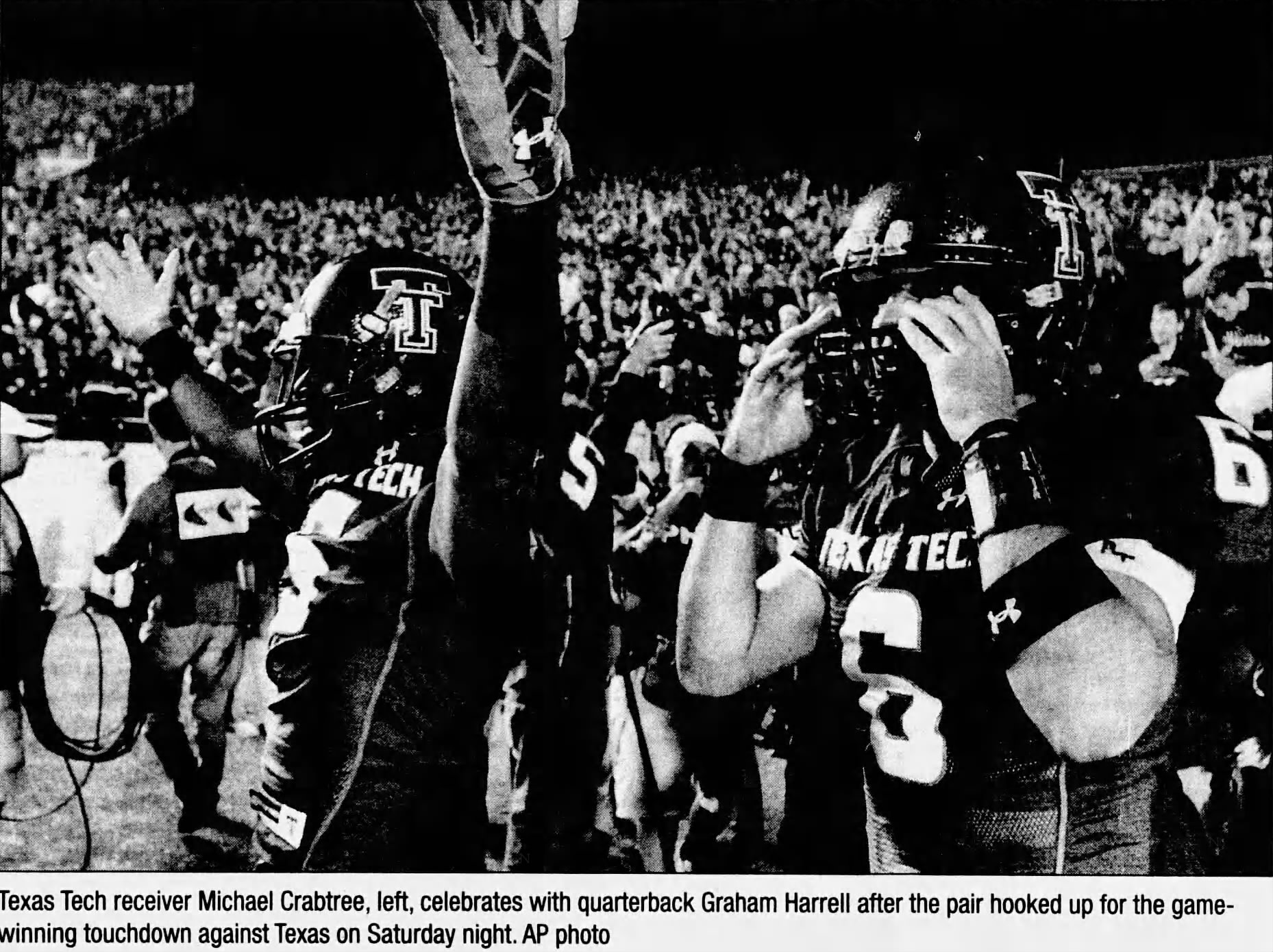 Coach Leach called a simple isolation play. Harrell took the snap and launched a 28-yard pass toward the right sideline, targeting his star receiver, Michael Crabtree.