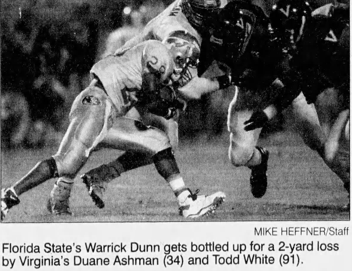 Despite Virginia’s control, Florida State—led by future NFL star running back Warrick Dunn—mounted a ferocious final drive. As the clock ticked down to zero, the Seminoles were positioned inside the five-yard line.